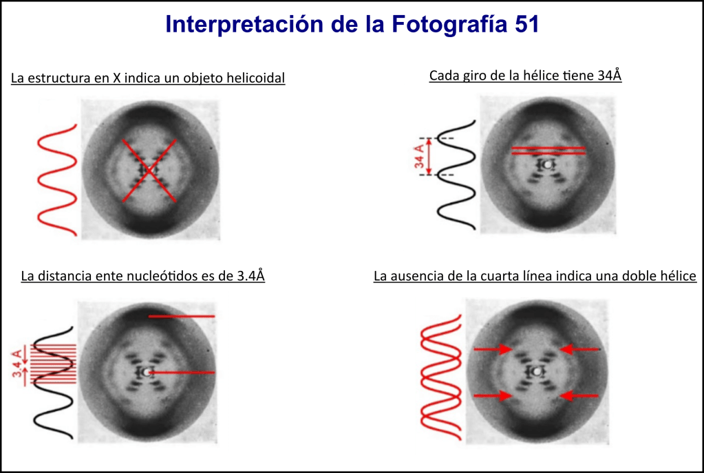 Para Franklin y su estudiante, Raymond Gosling, esa «X» era la firma matemática de una hélice. Las manchas oscuras en los extremos indicaban la repetición periódica de los elementos químicos que formaban la columna vertebral de la molécula. Sin embargo, Franklin, fiel a su rigor científico, se negaba a publicar un modelo teórico hasta no tener cálculos matemáticos que lo respaldaran por completo.
